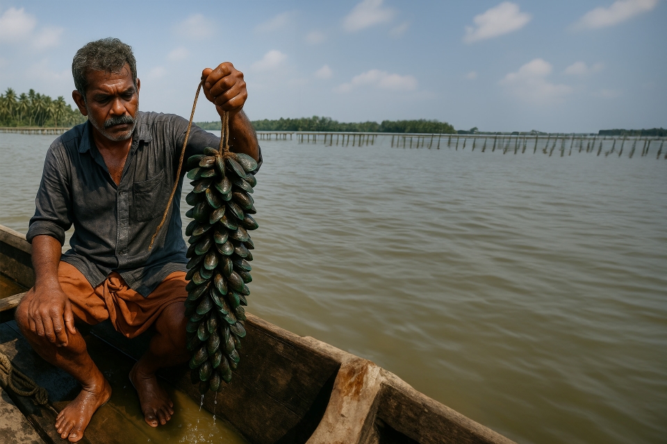 Along the Padanna–Kavvayi–Valiyaparamba backwaters, over 6,000 farmers—many in women’s groups—cultivate kallummakkaya (green mussels) on coir ropes tied to bamboo rafts. These brackish waters now produce over 7,000 tonnes annually, nearly 70% of India’s farmed mussels. The best harvests are in May and June, with fresh catch available from late April to August. Some still gather wild mussels from coastal rocks when tides permit—a traditional practice shaped by both season and tide.