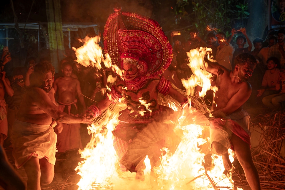 Yakshagana is a traditional folk theatre from coastal Karnataka and Kasaragod, blending dance, music, dialogue, and elaborate costumes to depict epics like the Ramayana and Mahabharata. Performed overnight in open-air village or temple settings, it features energetic movements and live music that create a vivid, immersive experience.